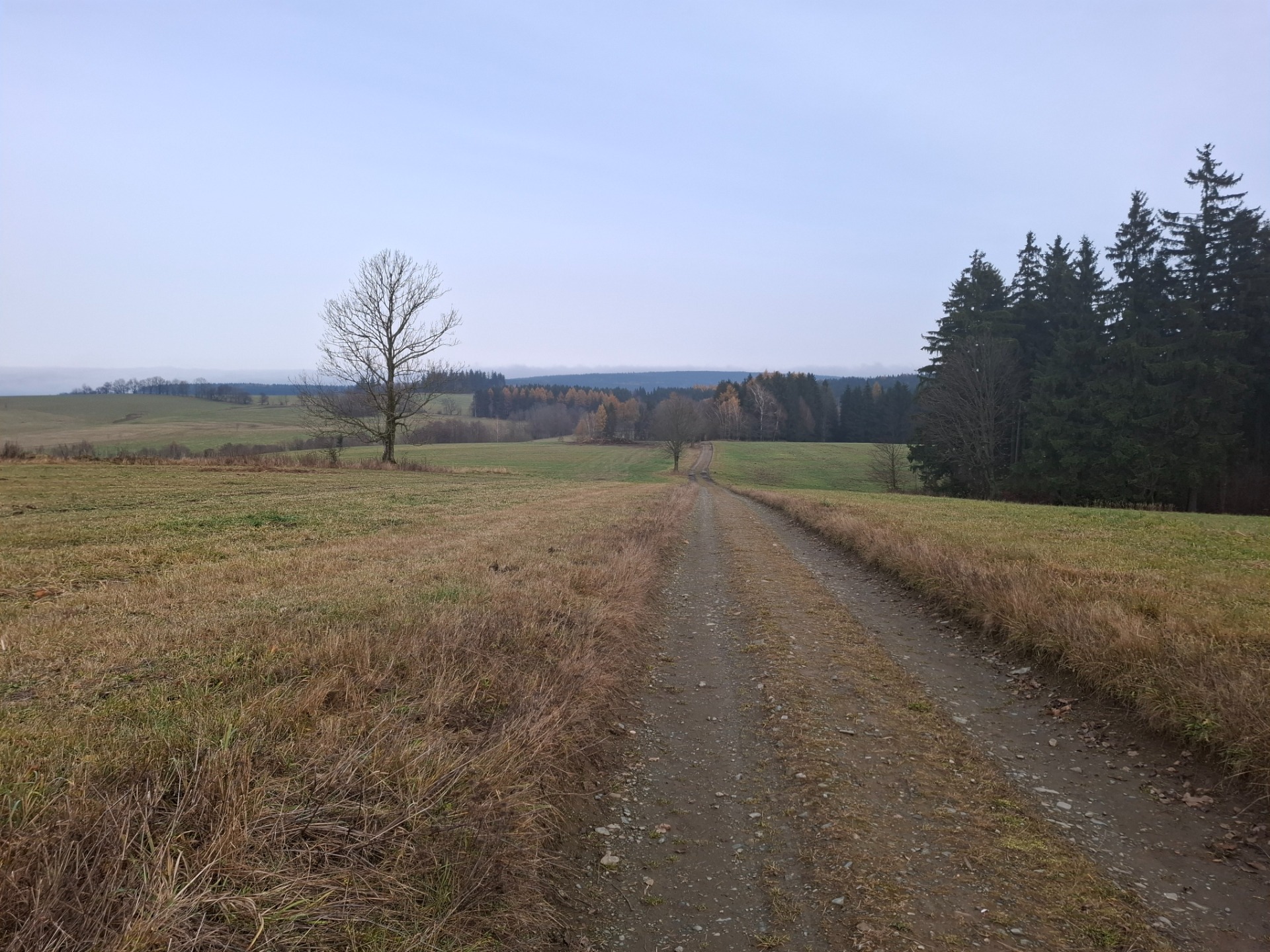 Odtud už jsem se rozhodla pokračovat pěšky po modré značce. Vystoupala jsem nad město a otevřel se mi výhled zpět i na okolní krajinu. Sluníčko moc nesvítilo, ale ani nepršelo. Opět jsem cítila cestu před sebou a užívala si krajinu. Lidí jsem moc nepotkala.