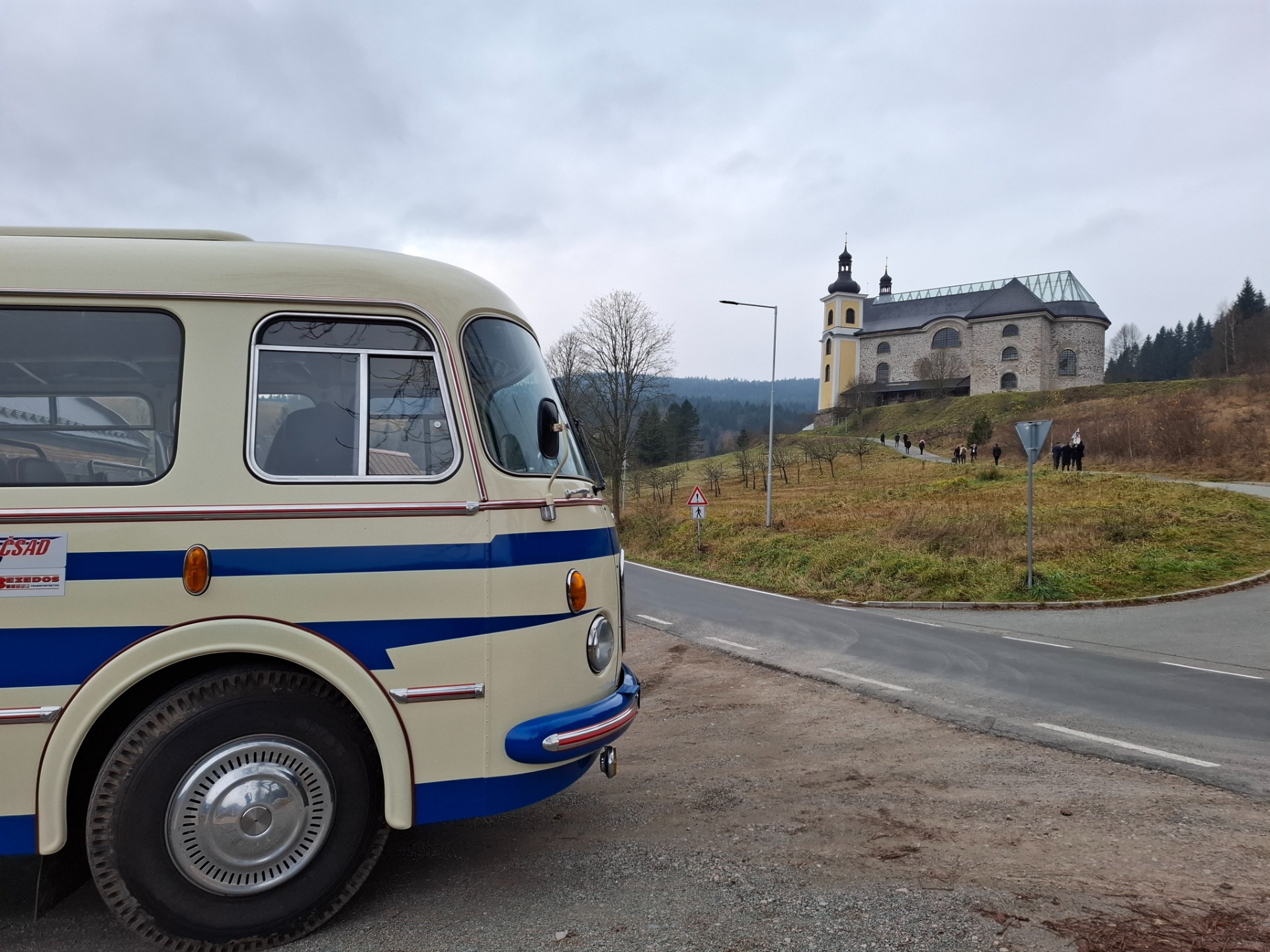 Chvilku jsem musela počkat, až otevřou sál. Při čekání přijel starý autobus i s osazenstvem v historických uniformách a vlajkou ČSAD. Ty ale nepřijeli na sraz. Odešli ke kostelu.