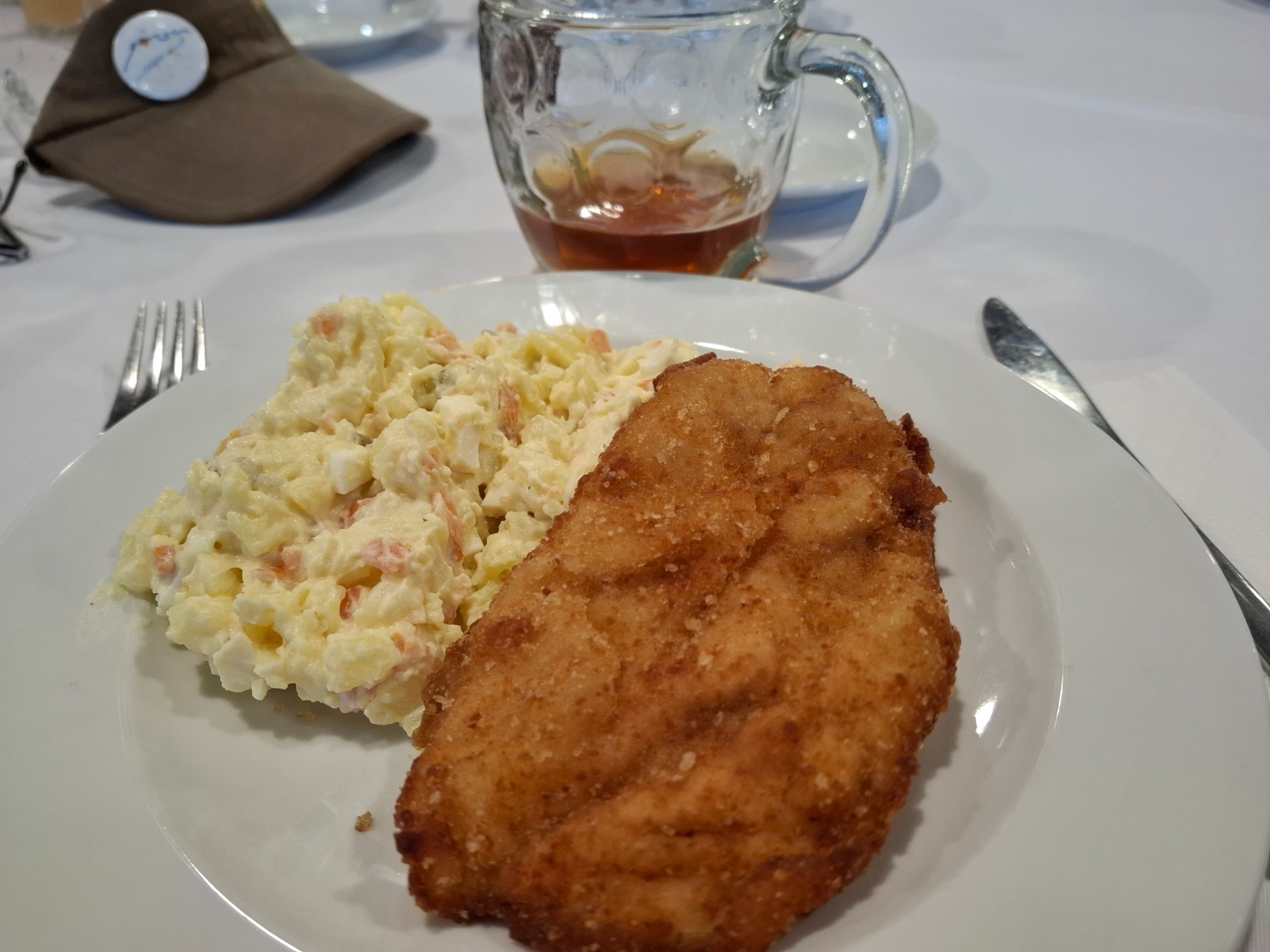 Vystála jsem si frontu na pivko a s ním jsem vešla do sálu. Bylo zde několik kulatých stolů, na kterých bylo prostřeno. Personál bistra se skládá ze zdravých a postižených zaměstnanců, kteří zde žijí. Vedle mě si sedl Viktor. Byl to milý člověk a padli jsme si do noty. Žije u Valašských Klobouků. Ještě si k nám přisedli manželé od Broumova a později ještě tři další lidi. Nejdříve jsme dostali polévku a po ní řízek a bramborový salát. Martin Úbl nás seznámil s programem setkání. Ještě jsem stihla kávu a makový dortík.